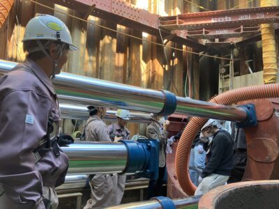 当日は、普段目にすることのない浄水場設備や進行中の推進管工事を間近で見学し、皆さん興味津々。